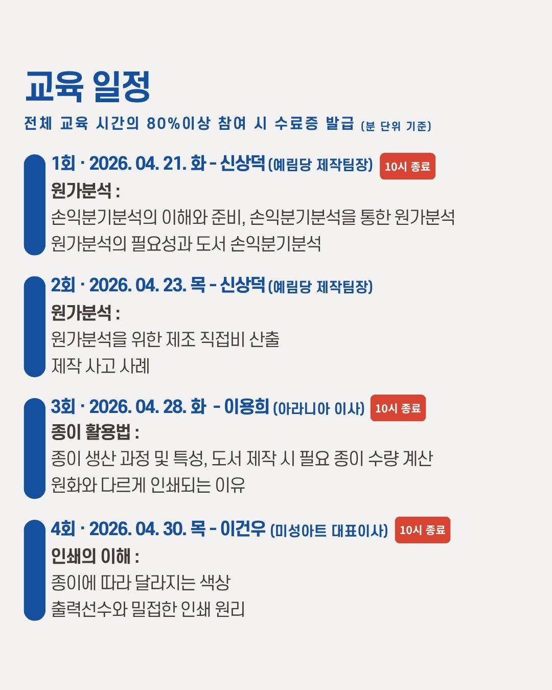- 전체 교육시간(분 단위)의 80% 이상 출석