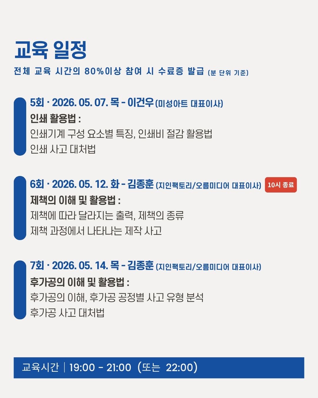 - 강의 시작/종료 시각 전후 10분까지 정상출결 처리되오니 교육 시간 엄수 부탁합니다.