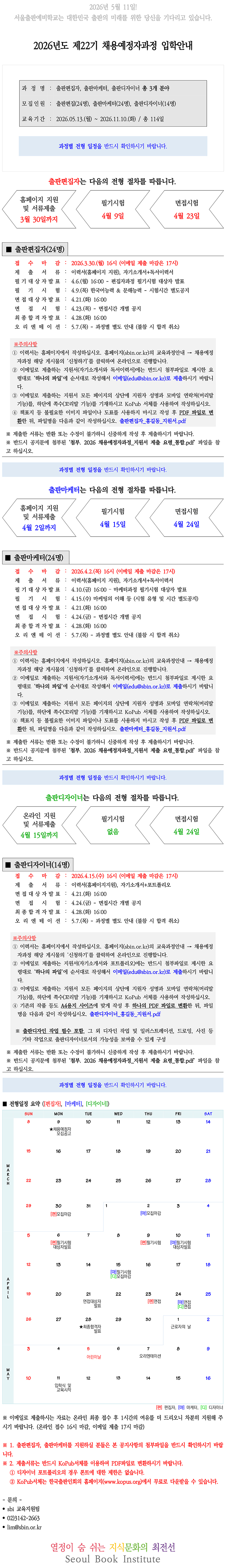 [입학안내] 2026년도 22기 채용예정자과정 모집 공고 ‘신청하기’ 버튼은 내용 작성 후 신중히 클릭해 주시기 바랍니다.!! 첨부파일 첨부1.-2026-채용예정자과정_지원서-제출-요령_통합.hwp 목록